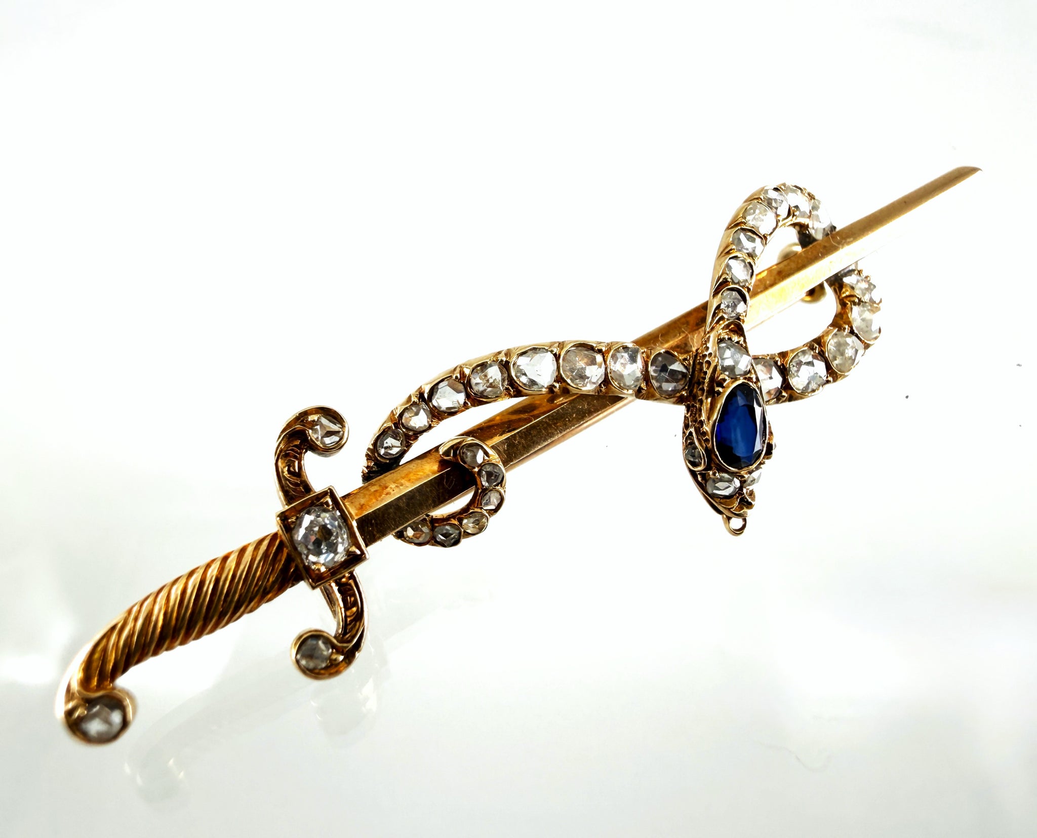 Nadel in 585/-- Roségold, Schwertform, umwunden von einer Schlange, ausgeziert mit anfacettierten Diamanten (Rosen), auf dem Kopf der Schlange ein ovaler Saphir ca. 0,3ct , L 6,5cm, GesGew. 6,8g.