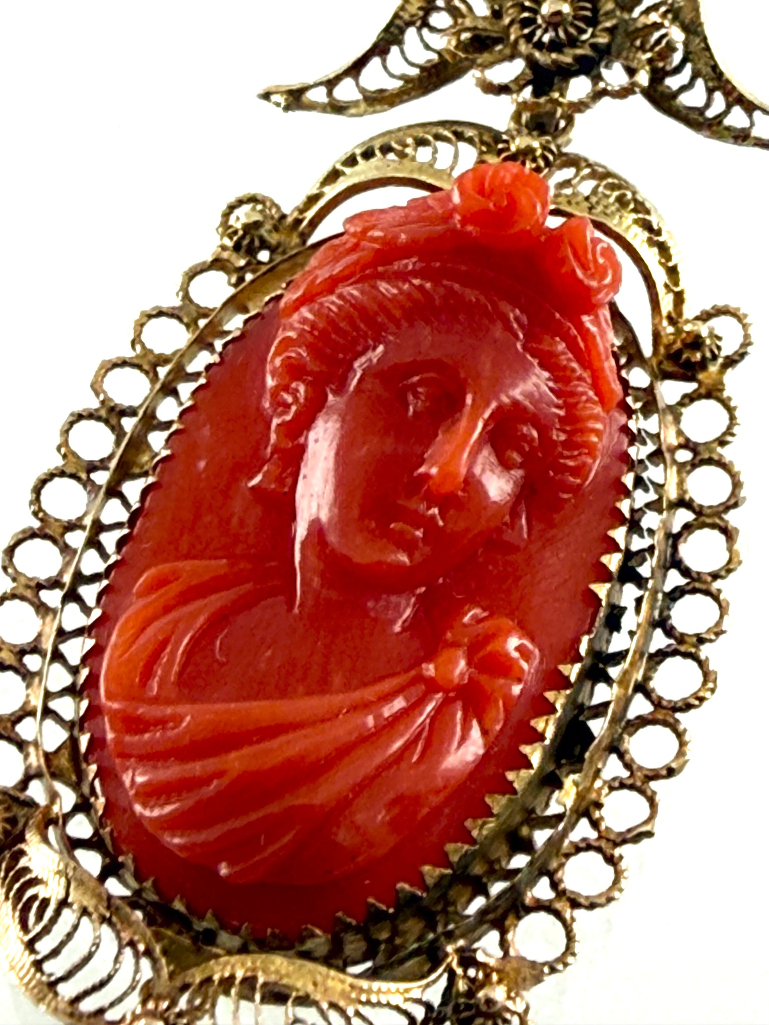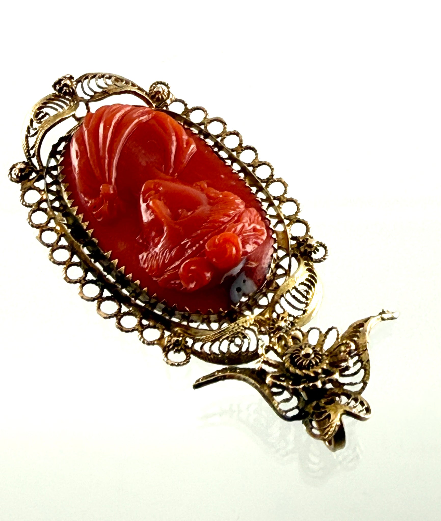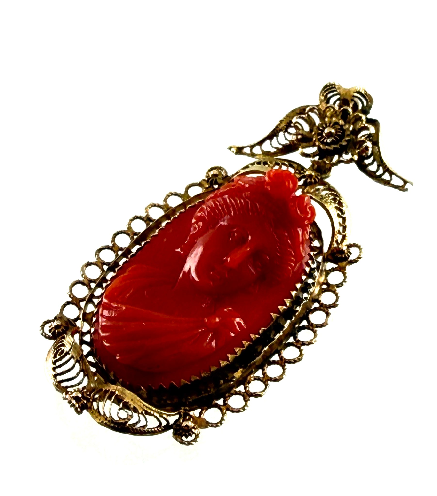sehr fein gearbeitete Golddrähte und -bleche aus 585/-- Gelbgold im Cannetille-Stil, geschnittenene italienische Koralle mit dem teilplastischem Abbild einer antiken Schönheit, der untere Teil des Anhängers ist beweglich eingehängt, Maße 4x2cm.